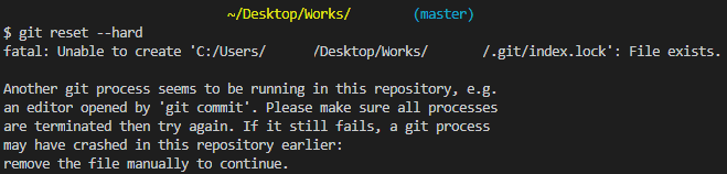 코드를 구현한 후 commit을 하려고 하는데 commit 명령어가 사용되지 않았다. commit뿐만이 아니라 checkout, pull 등 git 명령어가 모두 사용되지 않았다. 그리고 아래 에러 메시지가 표시되었다.