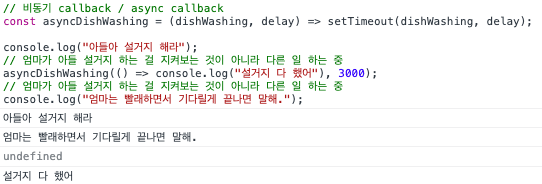 호출을 하였으면 호출에 대한 응답을 기다리지 않고 다음 작업을 하는 것입니다. 아래 코드를 확인해봅시다. (코드는 3초 후 설거지를 실행하는 것이지만, 3초 동안 설거지를 한다고 가정합시다.)