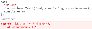 food가 초밥 or 고기인 경우 onSuccess callback 함수에 food를 넘겨줍니다. 그 외인 경우 onError callback 함수에 Error 객체를 넣어줍니다.