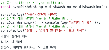 위와 같이 진행이 되었습니다. 즉 엄마는 아들이 설거지를 끝낼 때까지 기다렸습니다. 그리고 끝나서야 다른 작업을 하기 시작합니다. 이게 동기입니다. 그렇다면 비동기 callback은 무엇일까요? 대충 감이 오시죠?