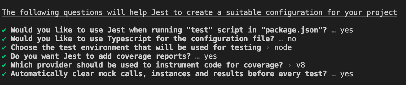 위 명령어를 사용하여 jest를 설치해 줍니다. 그리고 기본적인 jest 셋팅을 위해 아래 명령어를 입력해줍니다.