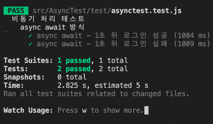 위 코드에서 확인할 수 있는 것처럼 resolves, rejects를 사용하면 보다 더 깔끔하게 promise로 비동기 테스트 처리를 할 수 있습니다. 그 다음 마지막으로 async await 방법으로 테스트를 해보겠습니다.