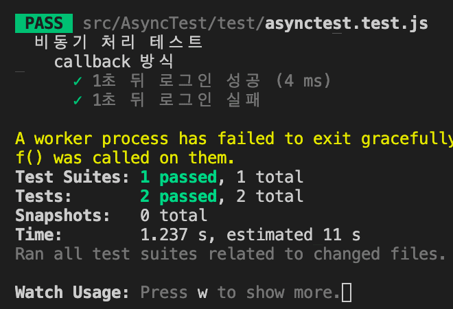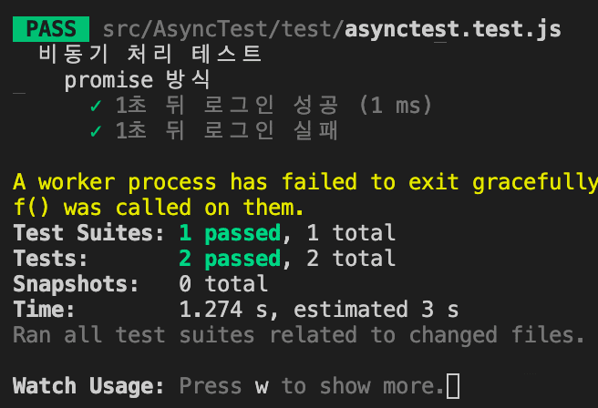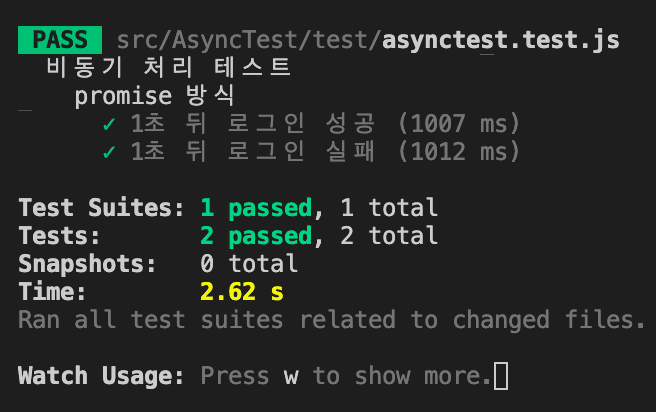 테스트에 통과했습니다. 그러나 이전 callback 함수 테스트한 것을 보았듯이 이번 테스트도 1초보다 더 빠르게 끝났습니다. 즉 이번에도 호출만 하고 끝이난 것이죠. 그럼 어떻게 하면 될까요? 동일하게 done을 사용하면 됩니다. 아래 코드처럼 수정해봅시다.
