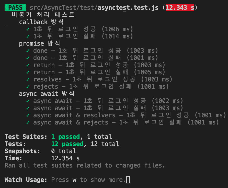 이번 게시글에서는 callback, promise, async await 을 이용하여 비동기 처리 테스트 방법을 알아보았습니다. 각각의 방식에서도 여러 방법을 알아보았는데, 많은 방식을 알고 1가지 방식을 사용하는 것과 1가지 방식만 알아서 1가지 방식만 사용하는 것 은 많은 차이가 있다고 생각됩니다. 자신에게 맞는 방식을 사용하시면 될 것 같습니다. 도움이 되셨으면 좋겠습니다. 아래는 모든 테스트 코드 최종 결과입니다. 테스트 코드의 추가 장점 문서화가 잘 되는 것을 확인할 수 있습니다.