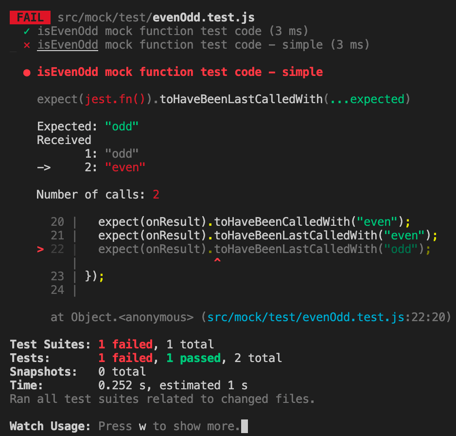 toHaveBeenCalledTimes로 총 호출 횟수, toHaveBeenCalledWith로 인자 값 테스트가 가능합니다. 마지막으로 toHaveBeenLastCalledWith matchers를 추가해보았는데요. 해당 matchers는 마지막 인자의 값을 테스트 하는 것입니다. 즉, even이 나와야 하는데 odd가 포함되어 있으면 테스트가 실패하게 됩니다. 아래 결과 이미지를 확인해봅시다.