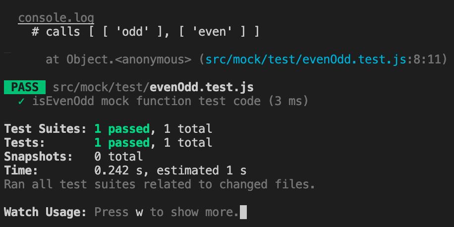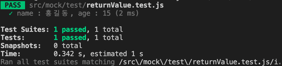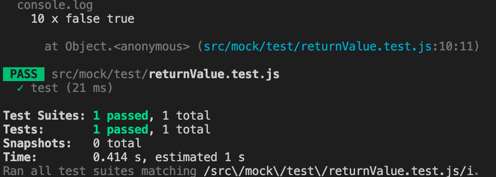 임의의 값을 반환해주는 함수를 만들기 위해서는 끝이 아닌 시점까지 mockReturnVlaueOnce, 마지막인 경우 mockReturnValue matcher를 사용하면 됩니다. 위 mock 함수는 순서대로 10, x, false, true 의 결과를 줍니다. 따라서 테스트를 진행하면 결과 값으로 10, x, false, true 가 표시됩니다. 그리고 호출도 4번 하였으니 test는 정상적으로 통과됩니다.