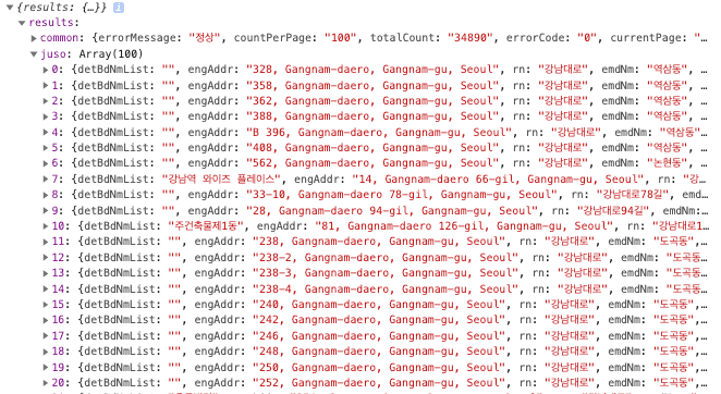 여기서 응답 구조를 빠르게 파악하고 내가 관심있는 key 값을 빠르게 찾아야 한다. 데이터 구조를 자세히 보면 results 안에 있는 juso를 이용해야할 것 같다라는 생각을 할 것 이다. 그럼 juso에 접근하여 juso 배열을 console로 찍어보자.