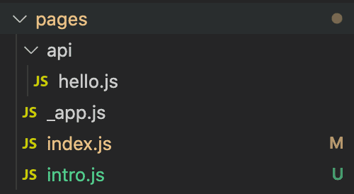 예를들어 /test/intro/a 와 같은 url을 만들고 싶으면 pages 폴더 아래 test 폴더 -> intro 폴더 -> a.js 파일을 만들면 됩니다. 그럼 해당 url로 접속할 경우 a.js 컴포넌트가 보여집니다. 그럼 예시로 /intro url를 생성해봅시다. 아래 이미지와 같이 pages 폴더 아래 intro 파일만 생성해주면 됩니다.