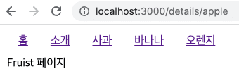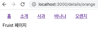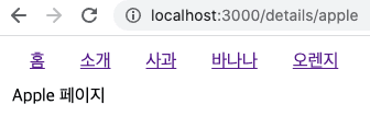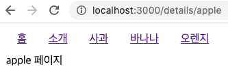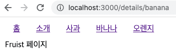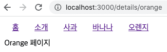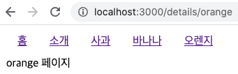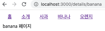 위와 같이 수정하게 되면 사과 바나나 오렌지 링크 중 무엇을 눌러도 해당 페이지가 표시됩니다. 즉, details/... details 아래 어떠한 url이 오더라도 해당 페이지가 보이게됩니다. 아래 결과를 확인해봅시다.