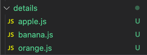 위처럼 구현하게 되면 확장성이 없습니다. 만약 과일 관련 api를 호출하여 어떠한 과일을 보여줄지 모른다고 가정해봅시다. 만약 melon이 온다면 melon.js 파일을 또 만들어주어야 합니다. 그럼 몇 개가 될 지 모르는 파일을 모두 생성해야하는데 사실 불가능합니다. 그럼 어떻게 할 수 있을까요? 아래처럼 details 폴더를 수정해줍니다.
