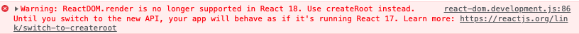 Warning: ReactDOM.render is no longer supported in React 18. Use createRoot instead. Until you switch to the new API, your app will behave as if it's running React 17. Learn more: https://reactjs.org/link/switch-to-createroot