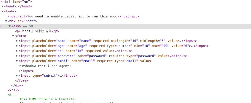 위 코드는 너무 간단하게 따로 코드에 대한 설명은 하지 않겠습니다. 그러나 코드를 확인해보면 약간 불편한(문제점) 부분이 있습니다. 우선 data, errors state가 확장성이 없습니다. 다시 말하면 input field개 1개 추가되거나 삭제될 때마다 state도 추가, error handling도 추가 ... 등 해주어야 할 작업이 많이 있습니다. 그리고 onSubmit 이후 모든 input에 대한 error handling을 각각 해주어야 합니다. 이러한 경우 실수를 할 확률이 많이 있습니다. 또한 마지막 문제의 경우는 매우 희박하지만 사용자가 직접 개발자 도구를 통해 input element를 수정할 수 있습니다. 위 코드의 경우 이러한 경우를 생각하여 error handling을 추가로 하였습니다. 해당 조작하는 것을 아래 이미지로 확인해봅시다.