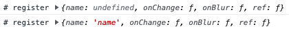 위 결과 이미지를 보면 알 수 있지만 인자 값에 아무것도 넣지 않았을 경우 name=undefined, 값이 있는 경우는 name=name(해당 값)으로 나옵니다. 그리고 그 외 onChange, onBlur, ref 가 있습니다. 이것을 input element에 담아주어야 합니다. 코드로 확인해보면 아래와 같습니다.