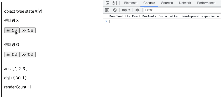 아래 이미지를 보면 렌더링 X의 경우 object의 주소 값을 변경하지 않은 경우이고
