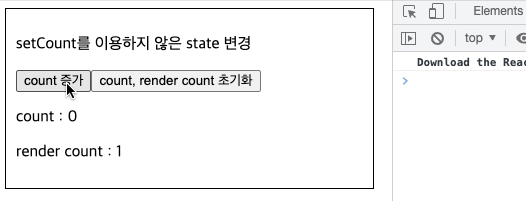 콘솔 창을 보면 count, render count 값이 변하지 않는다.