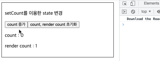 추가로 state가 변경되었으니 render count도 증가하는 것을 확인할 수 있다.