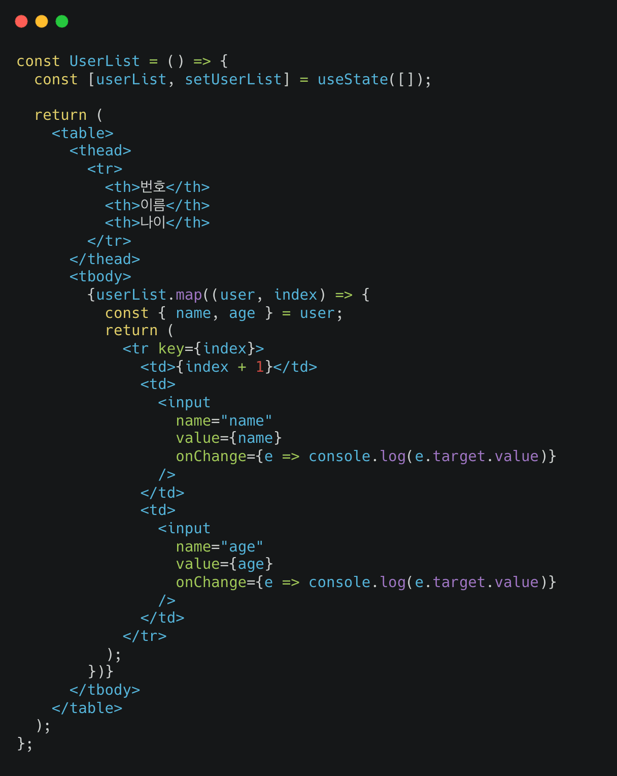 이번 게시글에서는 state를 이용하여 간단한 동적 테이블을 구현해보자