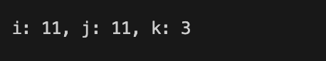 console.log(`i: ${i}, j: ${j}, k: ${k}`);