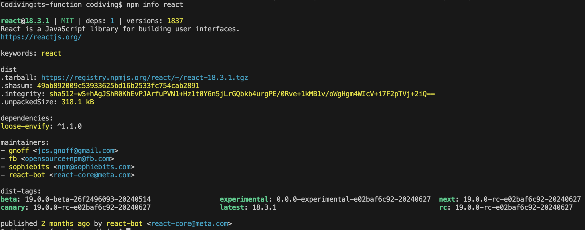 npm info 패키지 이름으로 정보를 확인할 수도 있습니다.