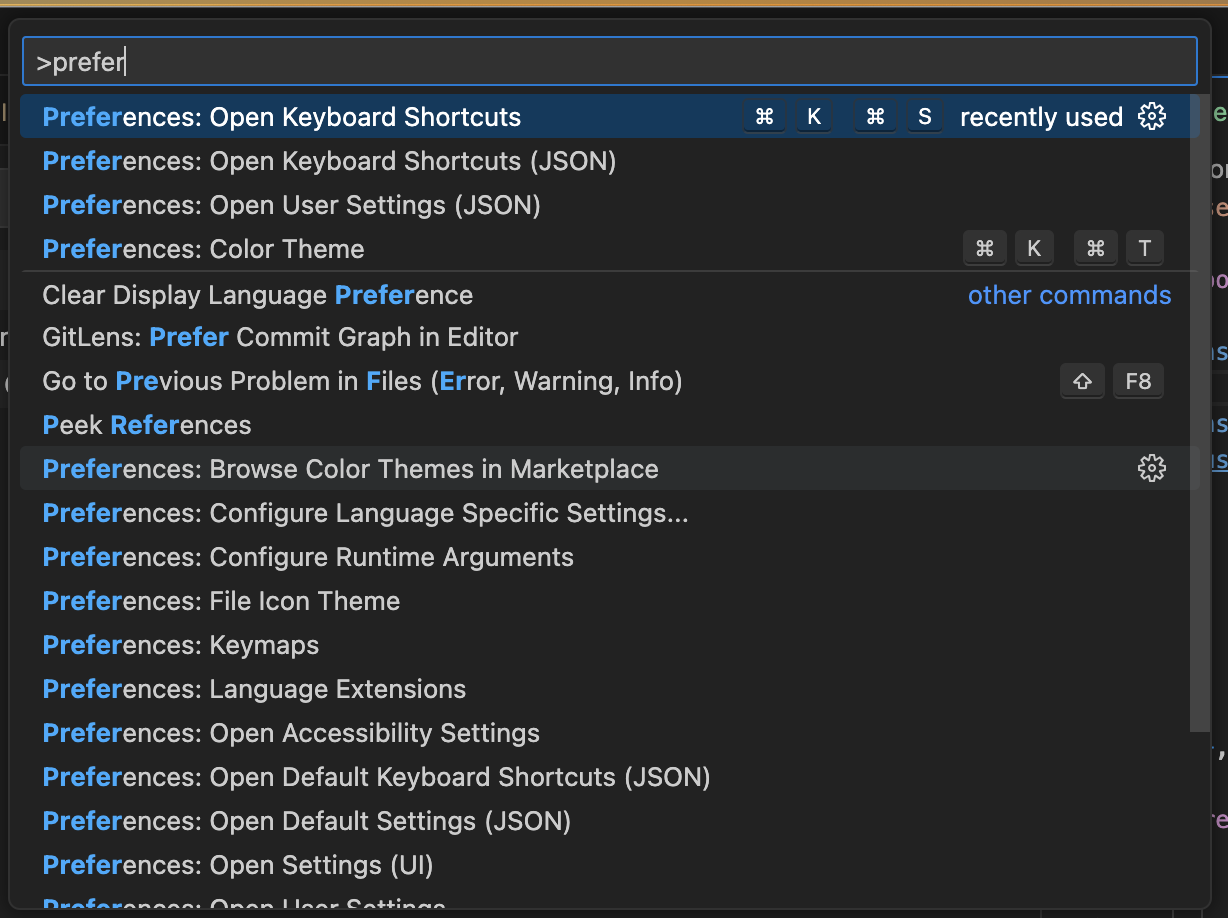 아래와 같은 입력창이 표시되는데 Preference: Open Keyboard Shortcuts를 입력해줍니다.