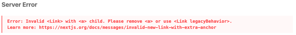 Error: Invalid <Link> with <a> child. Please remove <a> or use <Link legacyBehavior>.