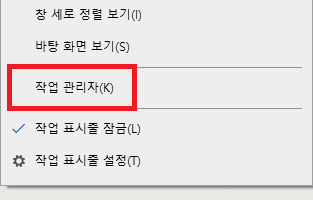 Crtl + Alt + Delete -> 작업관리자 선택 or 작업표시줄 우클릭 -> 작업관리자 선택