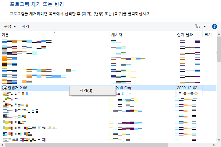 삭제하고자 하는 프로그램 명에 우클릭을 한 후 제거를 진행하자. 여기서 완료가 되었다면 이제 피씨에서 해당 프로그램이 삭제되었다. 그러나 해당 프로그램이 있던 폴더가 완벽하게 삭제되지 않는 경우도 있으니 해당 폴더로 가서 마저 삭제해도 되겠지만, 굳이 그럴 필요까지는 없어보인다.