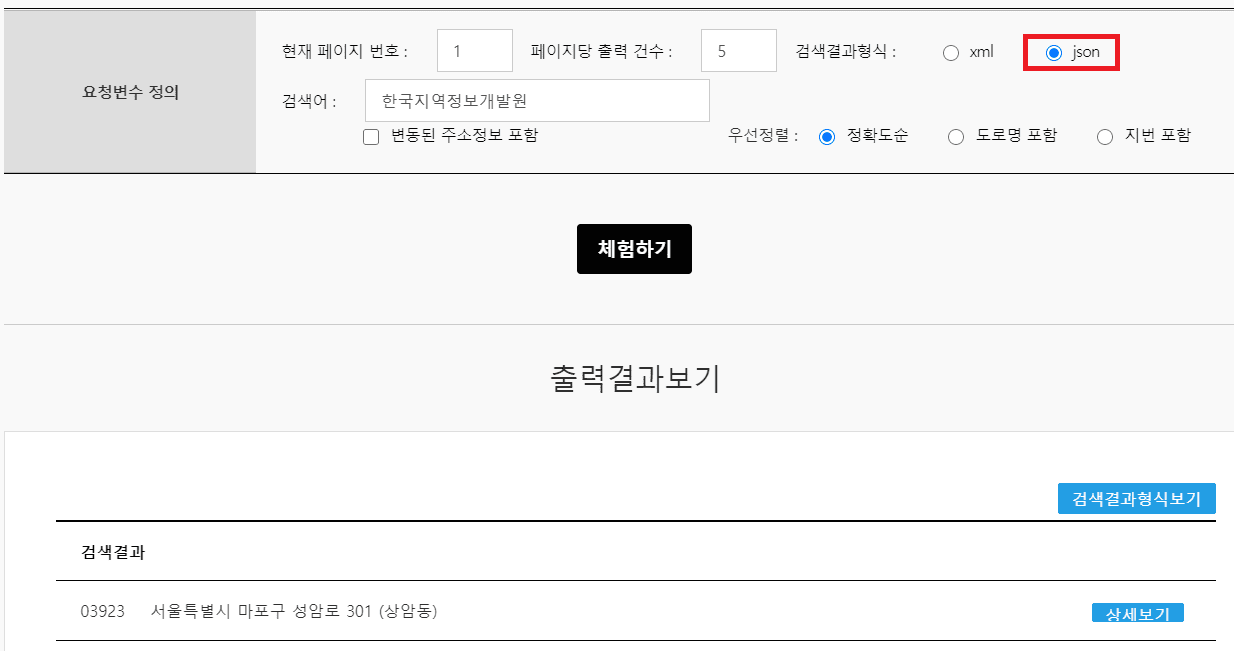개인적으로 xml보다 json 데이터가 파싱하기 더 편하기 때문에 json으로 검색 결과를 선택해주고 검색을 해보자. 그럼 아래 이미지와 같이 결과가 나오는 것을 볼 수 있다.