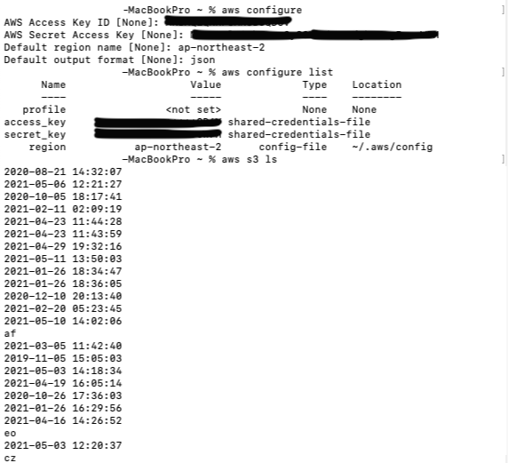 를 입력하면 끝이 난다. 정상적으로 입력이 되었으면 내가 사용할 수 있는 s3 list를 확인해보자.