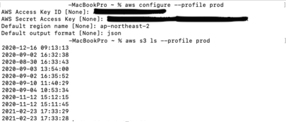 위 계정도 정상적으로 등록되었는지 확인하기 위해 bucket list를 확인해보자. 명령이 : aws s3 ls --profile "name" 그럼 해당 계정으로 접근이 가능한 bucket list가 보일 것이다.