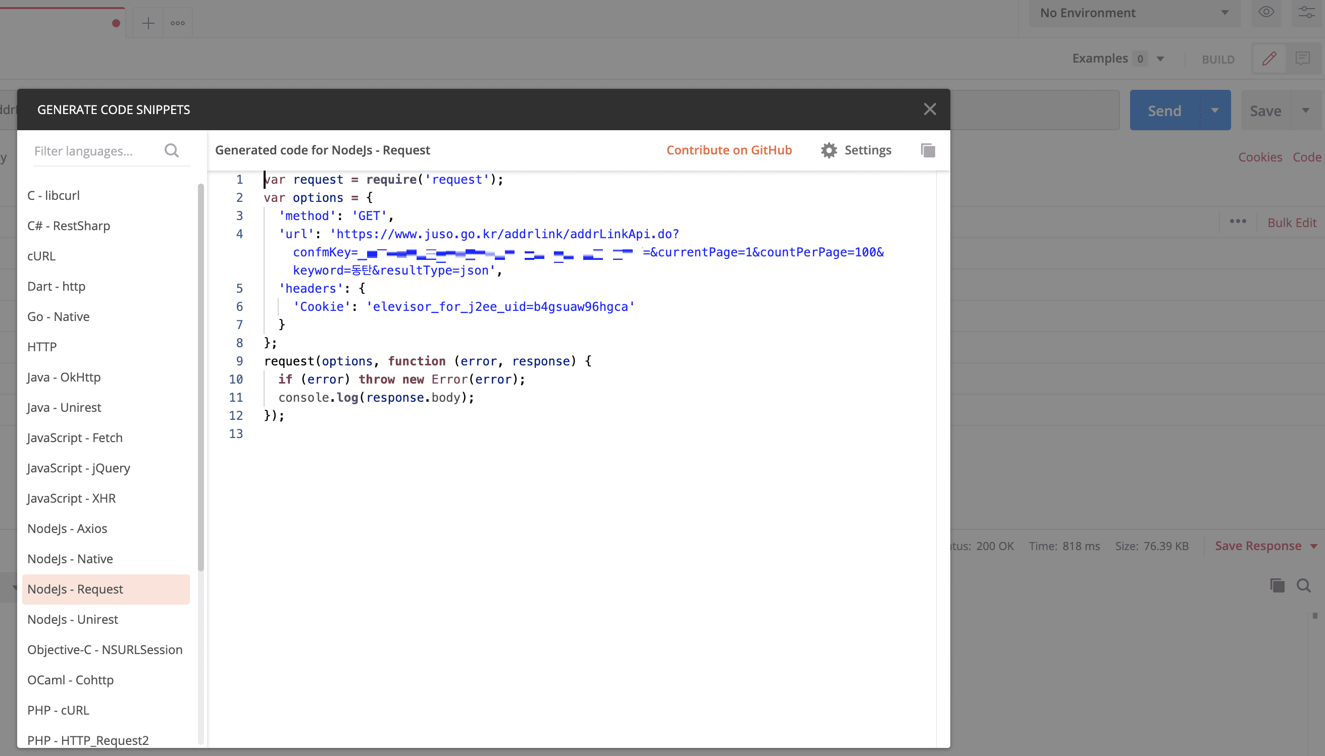 위 방식은 사실 웹 주소창에 동일하게 입력하여도 똑같은 결과 값을 얻을 수 있다. 그러나 이렇게 하는 또 다른 postman의 장점은 code를 만들어 준다는 것이다. 오른쪽 code를 클릭한 후 원하는 언어를 클릭하면 코드가 다 구현이 되어 있다. 이것을 참고로 구현하면 훨씬 더 빠르게 구현할 수 있을 것이다.
