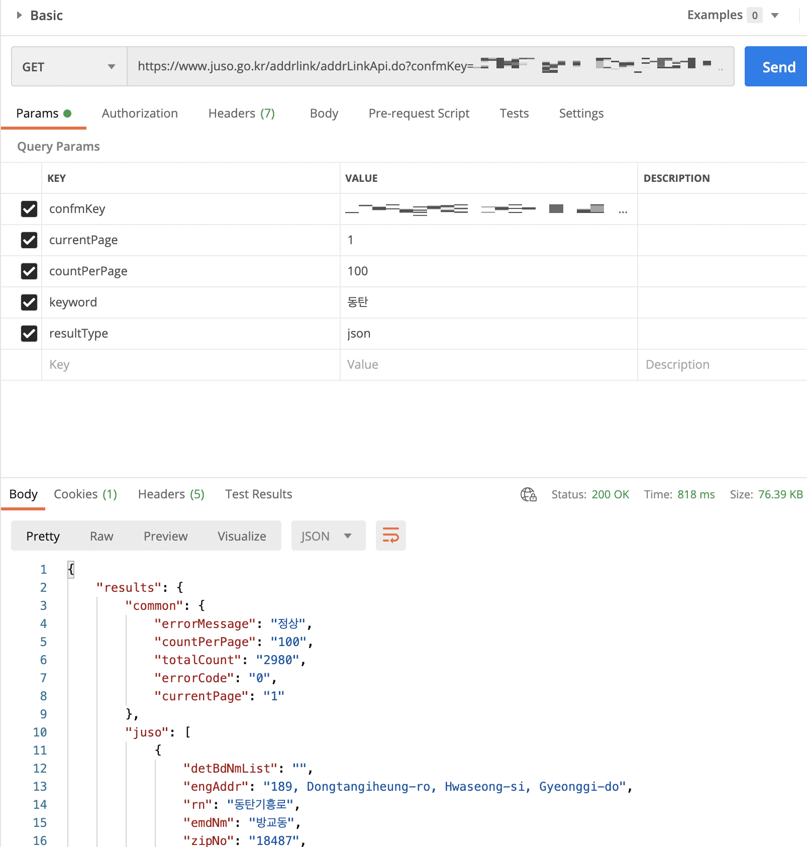우선 GET으로 맞춰주고 기본 url 먼저 작성해보자. GET은 ?로 이후 params를 이어나가면 된다. 주소 찾기에서 필수 요청 변수 값들은 confmKey, currentPage, countPerPage, keyword가 있다. 이 값을 전부 채워서 요청하면 된다. Params 탭에 들어가 key에 해당 변수명을 넣고 value에 원하는 값을 넣어주면 된다. 그러나 위 값만 채우면 xml 형태로 결과 값이 넘어오니 resultType을 추가로 넣고 값을 json으로 주어 요청을 해보도록 하자. Send 버튼을 클릭하면 아래 결과처럼 값이 넘어온다. 저 결과 값을 이용하여 원하는대로 구현하면 된다.