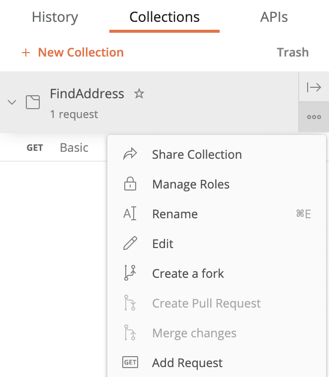 Postman 사용 방법은 간단하다. 우선 회원가입 후 로그인을 시도하면 아래와 같은 화면이 나온다. 여기서 Collections를 추가하고 그 안에 request를 추가하여 테스트를 진행해보면 된다. 우리도 한번 테스트를 진행해보도록 하자. Collection명은 FindAddress, request명은 Basic으로 하나 추가하였다.