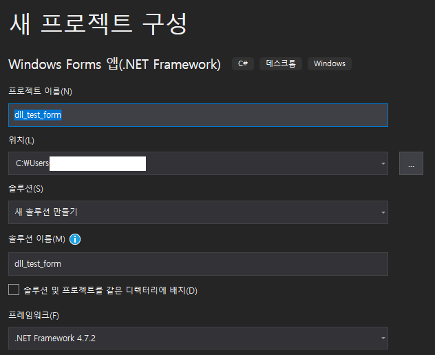 2. 프로젝트 명은 간단하게 작성해주자. 필자의 경우 dll_test_form으로 하였다.