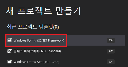1. 우선 새 프로젝트를 만들어야 한다. 프로젝트를 만들 때 Windows Forms 앱로 선택하여 만들도록 하자.