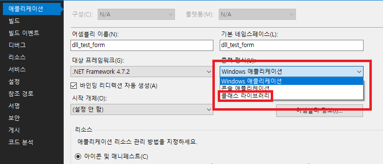 5. 출력 형식을 기존 Windows 애플리케이션에서 클래스 라이브러리로 변경하여 저장하자.