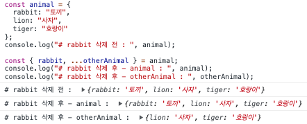 위 코드는 delete 명령어를 사용하였다. 결과를 확인해보면 rabbit이 정상적으로 삭제된 것을 확인할 수 있다. 그러나 animal 원본 객체에 변경이 있다. 즉 불변성이 지켜지지 않았다. 불변성을 지키면서 객체의 key를 삭제하고 싶으면 어떻게 할까?