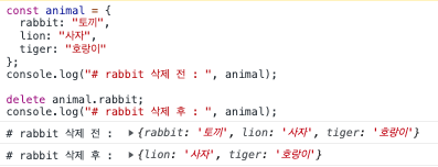 console.log("# rabbit 삭제 후 - animal : ", animal);
