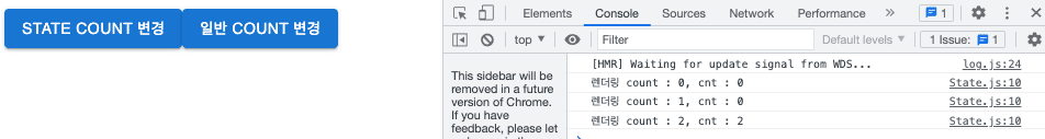 버튼 2개가 있는데 1개는 state를 변경하는 버튼, 나머지 1개는 일반 변수를 변경하는 버튼입니다. 아래 결과 이미지는 state 변경 1번, 일반 변경 2번, state 변경 1번을 진행한 결과입니다.