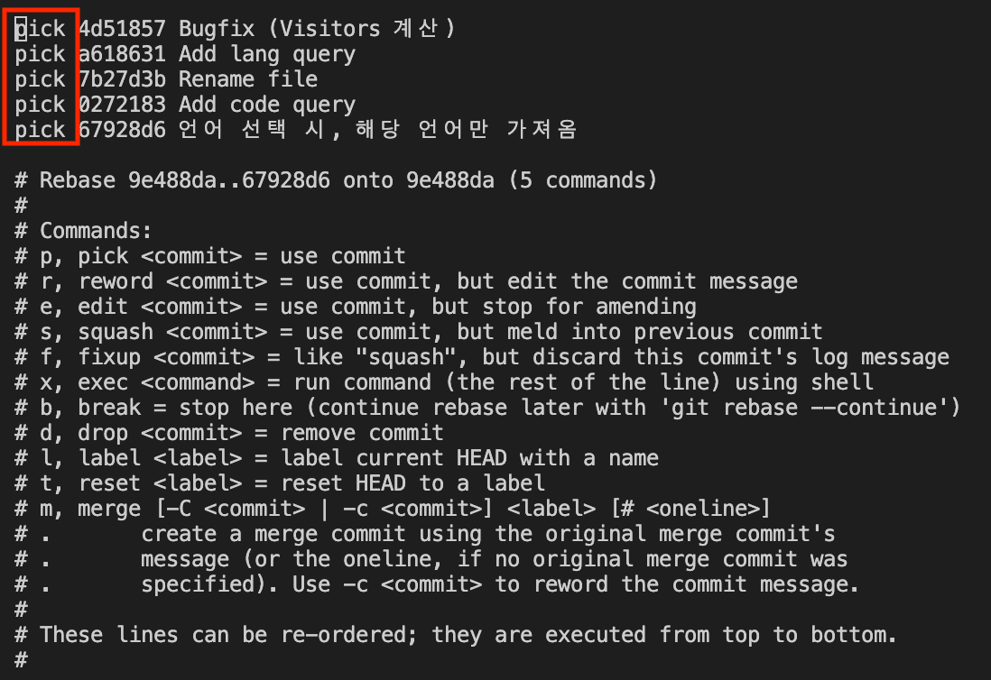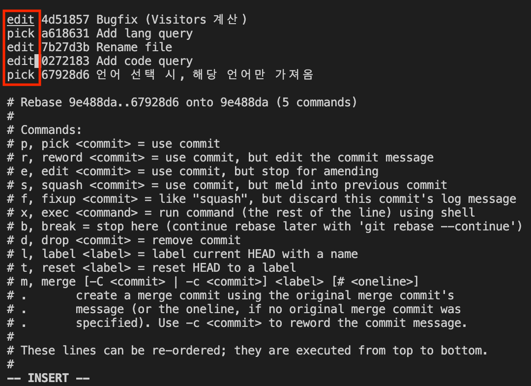 위 명령어를 입력하면 아래 처럼 표시될 것이다. i를 입력하여 insert mode로 변경하여 변경하고자 하는 commit hash 앞의 pick을 edit으로 변경하여 esc->:wq 으로 저장하고 나오면 된다.