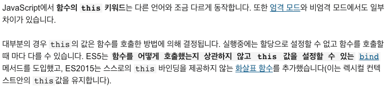 많은 언어에서 this가 사용된다. 그러나 JavaScript에서의 this는 조금 특이한 점이 있다. mdn 문서를 확인해보자.