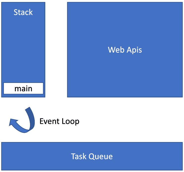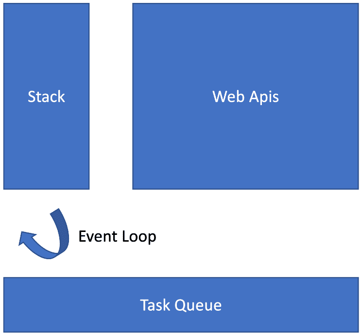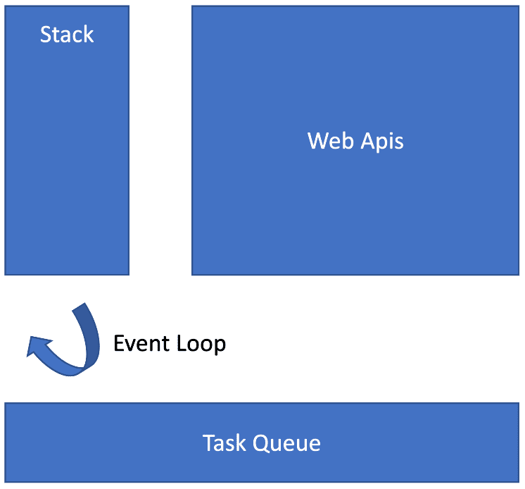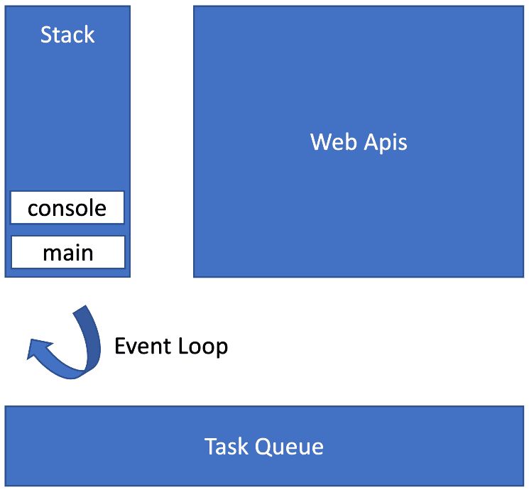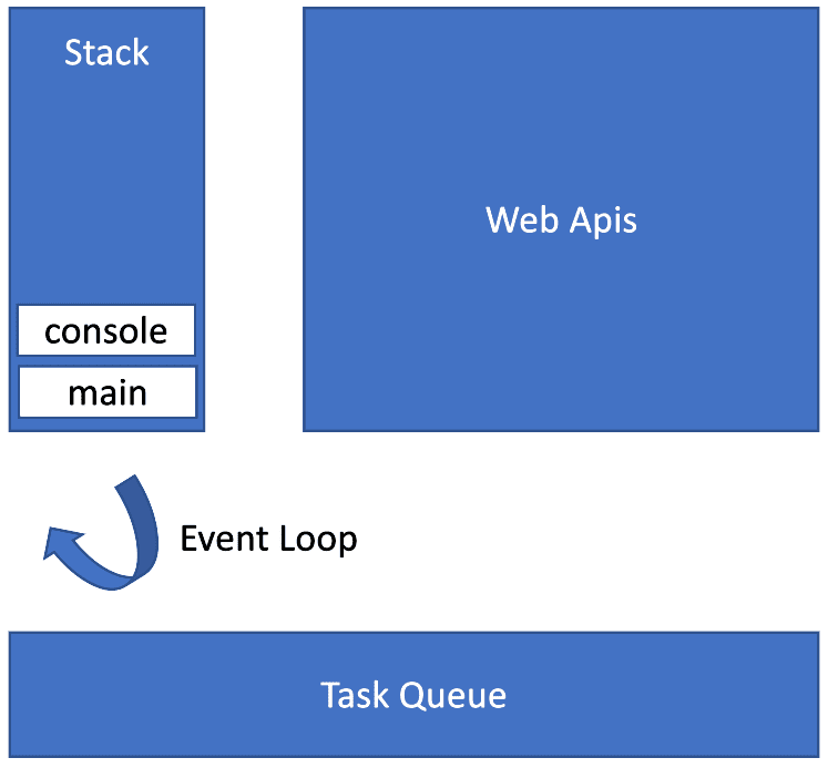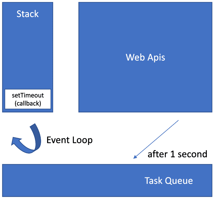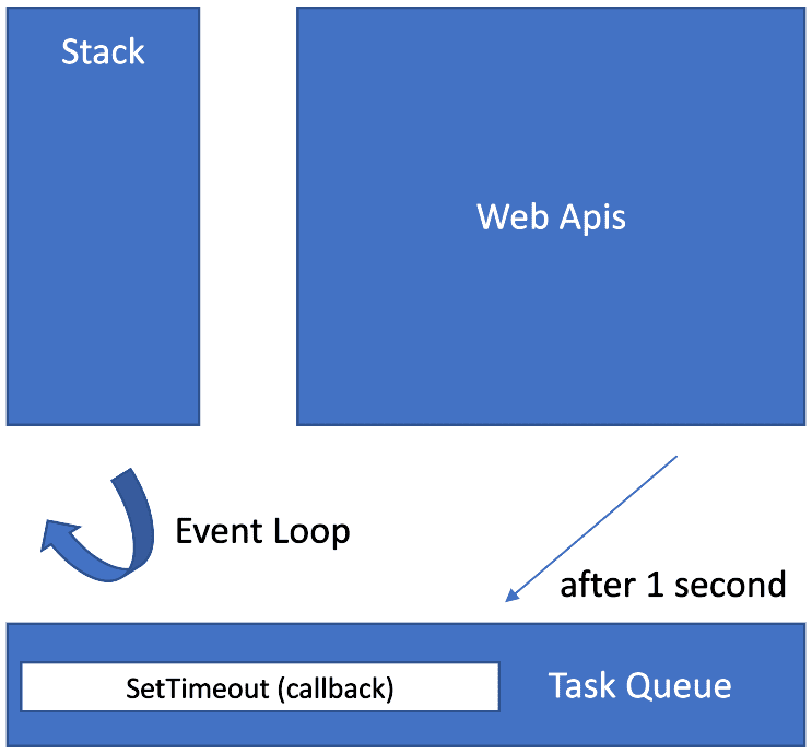 이해가 되시나요? stack에서는 계속 남아 있는 작업을 처리하고 있습니다. 그러다 중간에 setTimeout 함수가 들어오게 되는 데 이 함수의 경우 web api이므로 stack에서 처리하는 것이 아닌 web api에서 기다리게 됩니다. 그 동안 stack은 자신이 하고 있는 일을 계속 하는 것이죠. 여기까지는 이해가 쉽게 되셨나요? 그 이후 setTimeout이 1초가 지난 경우 stack에 바로 들어가는 것이 아닌 task queue에 들어가게 됩니다. stack이 하고 있는 일을 기다리고 있는 것이죠. 이후 stack이 다 비워졌으면 event loop가 task queue에 있는 setTimeout callback 함수를 stack으로 가져와 실행합니다. 간단하게 정리하면 아래와 같습니다.