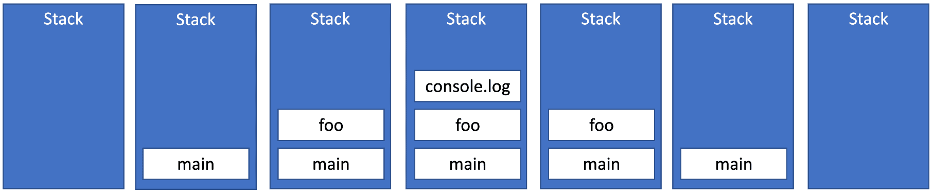 처음에 stack이 비어 있다가 main 함수가 실행되고 foo 함수 console.log 함수 순서로 실행되며 나중에는 하나씩 pop 되어 사라집니다. 이렇게 stack은 동작합니다. 그럼 아래 코드는 어떻게 될까요?