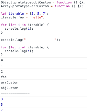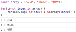 그러나 위 같은 경우 아래에서 확인해볼 for...of를 사용하는 것이 더 올바른 방법이라고 볼 수 있습니다. 왜냐하면 for...in 문은 순서에 상관없이 객체의 property를 하나씩 순회합니다. 따라서 배열의 index만 순회하는 것이 아닌, enumerable 한 property를 모두 순회합니다. 따라서 원하는 결과를 보장할 수는 없습니다.