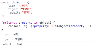 for...in 문은 object를 반복할 때 사용할 수 있습니다. 문자열로 key가 지정된 열거 가능한 속성에 대해 반복합니다. (Symbol이 key인 경우 제외)