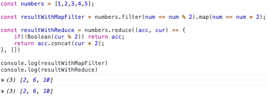 const resultWithMapFilter = numbers.filter(num => num % 2).map(num => num * 2);