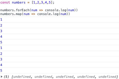 위 코드의 결과는 (거의)동일합니다. 그러나 map의 경우 용도에 맞게 사용하지 않았다고 볼 수 있습니다. 실제 결과 이미지를 보아도 마지막 undefined 5개의 배열이 출력되어 있습니다. 무엇이든 용도에 맞게 사용하는 습관을 길러야 합니다.